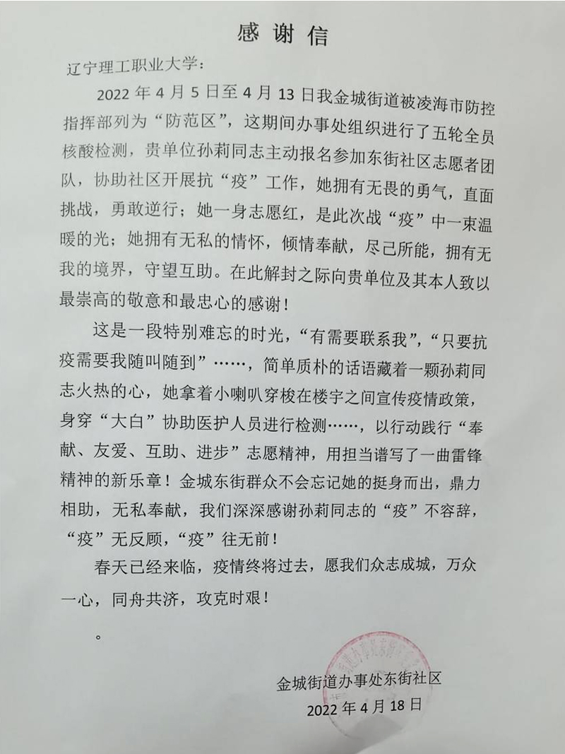 这是一封来自凌海市金城街道办事处东街社区的一封感谢信。信中温馨朴实的语言赞誉了抗疫中的一名志愿者——“她拥有无畏的勇气,直面挑战,勇敢逆行;她拥有无私的情怀,倾情奉献,尽己所能……她是此次战‘疫’中一束温暖的光。”