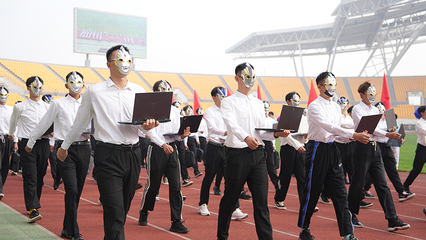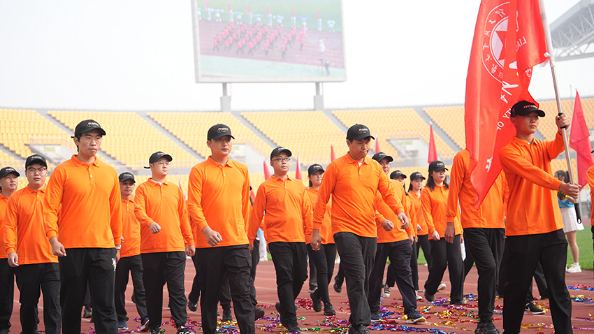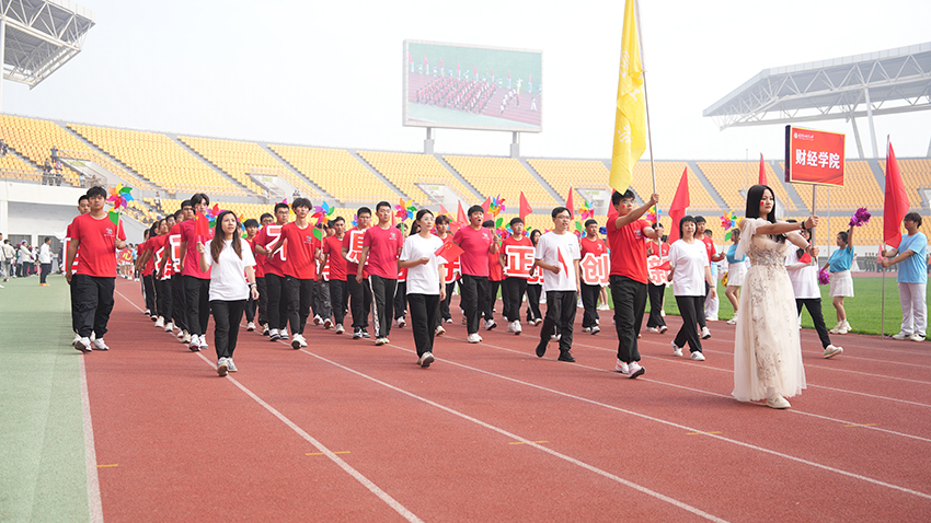 8时整,国旗队、校旗队、花环队、各学院学生与教工运动员方队依次入场。他们士气高昂,步伐整齐,口号嘹亮,充分彰显出我校师生昂扬向上、勇往直前的精神风貌。