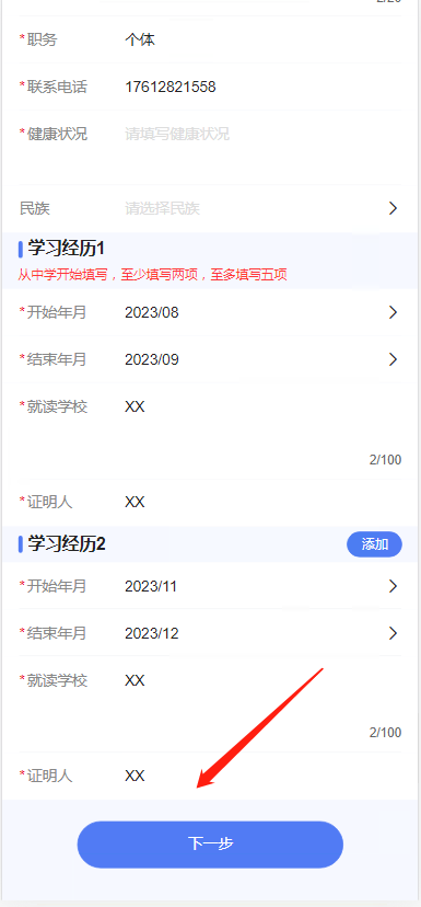 5、填写家庭信息和学习经历,完成后点击下一步。