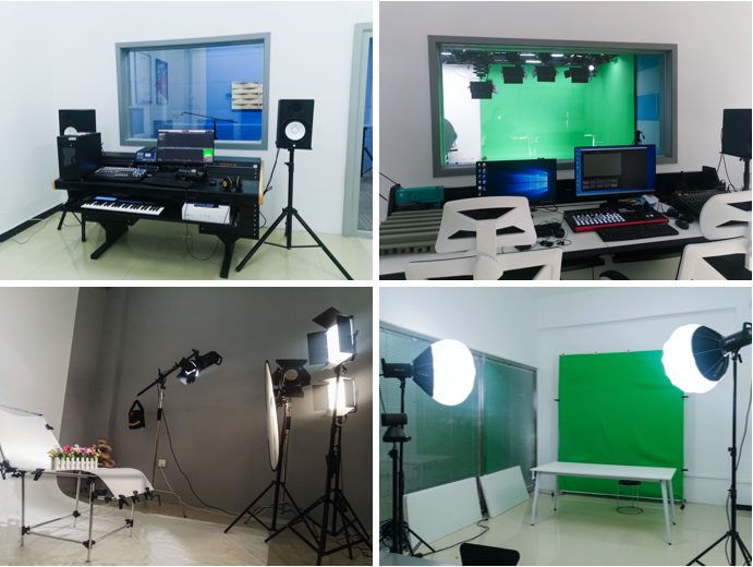 2022年4月建成新媒体生产(经营)性实训基地,基地内包含头脑风暴会议室、虚拟演播室、电商直播间3个、摄影工作室、网络直播实训室、录音工作室。促进学生实践能力、创新创业能力的提升。