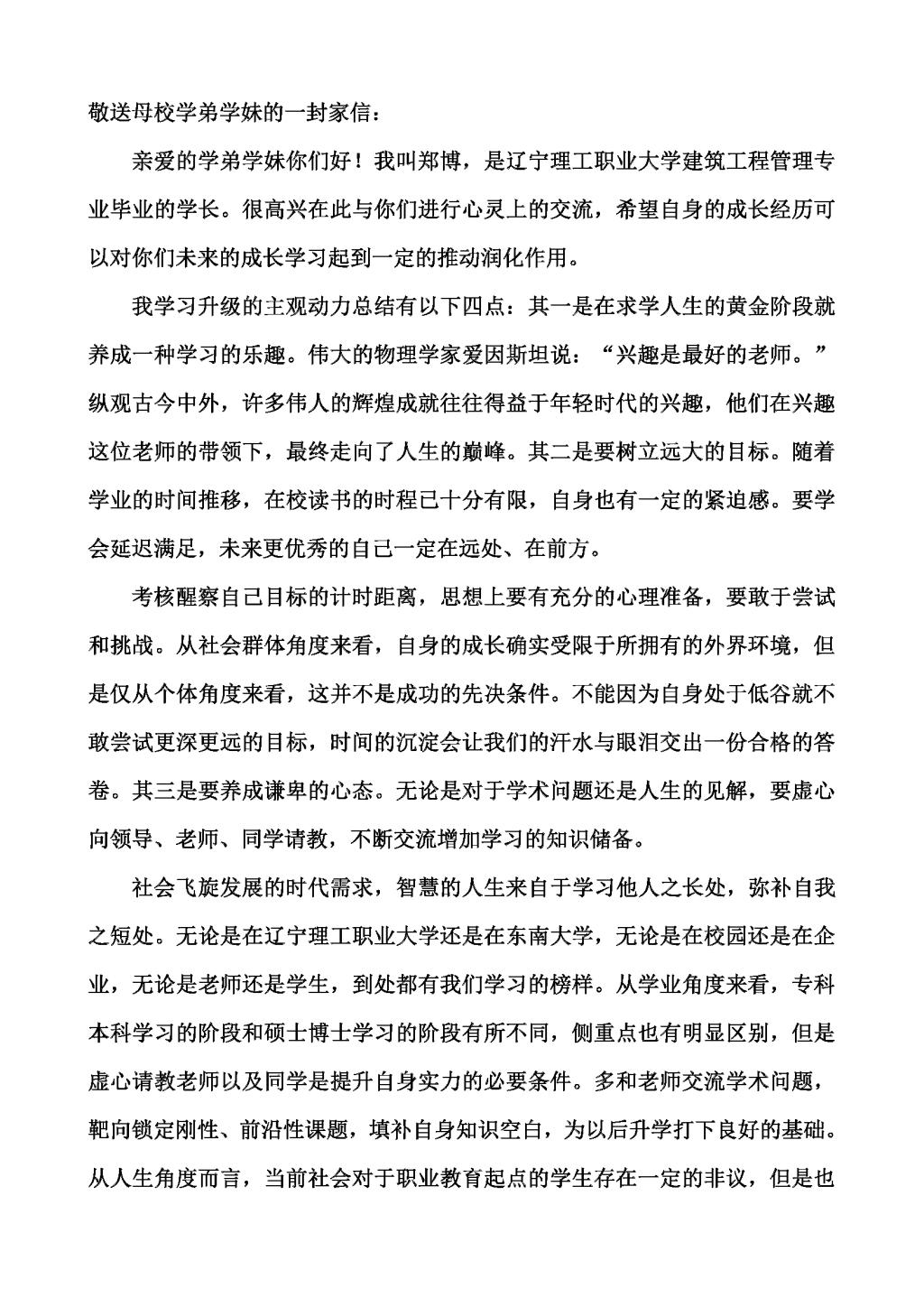 在读博士研究生郑博的这封信,充满了对学校的爱,也溢满了对学弟学妹们的情。这份浓郁的情和爱,将激励广大学子发奋读书、不负韶华,迈向更高的理想境界。