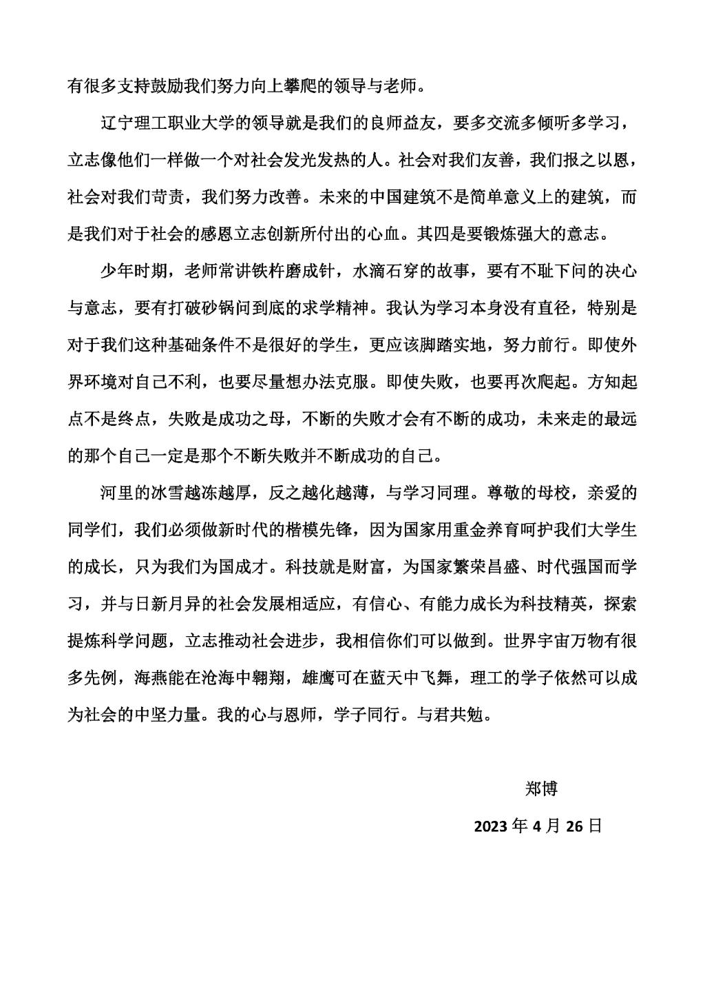 我们为辽宁理工职业大学而骄傲。郑博满怀深情对建筑学院领导表达:“无论何时何地我都自豪的说:辽宁理工职业大学是我的母校,是我腾飞的起点。”