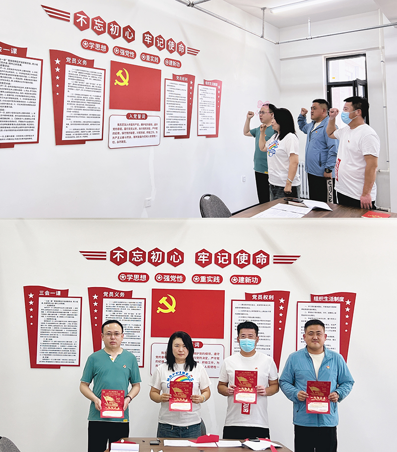 本次党支部会议为在6月份入党的党员同志举行了集体政治生日,4名“过生日”的党员同志接过生日贺卡,面向党旗重温入党誓词并留影纪念。