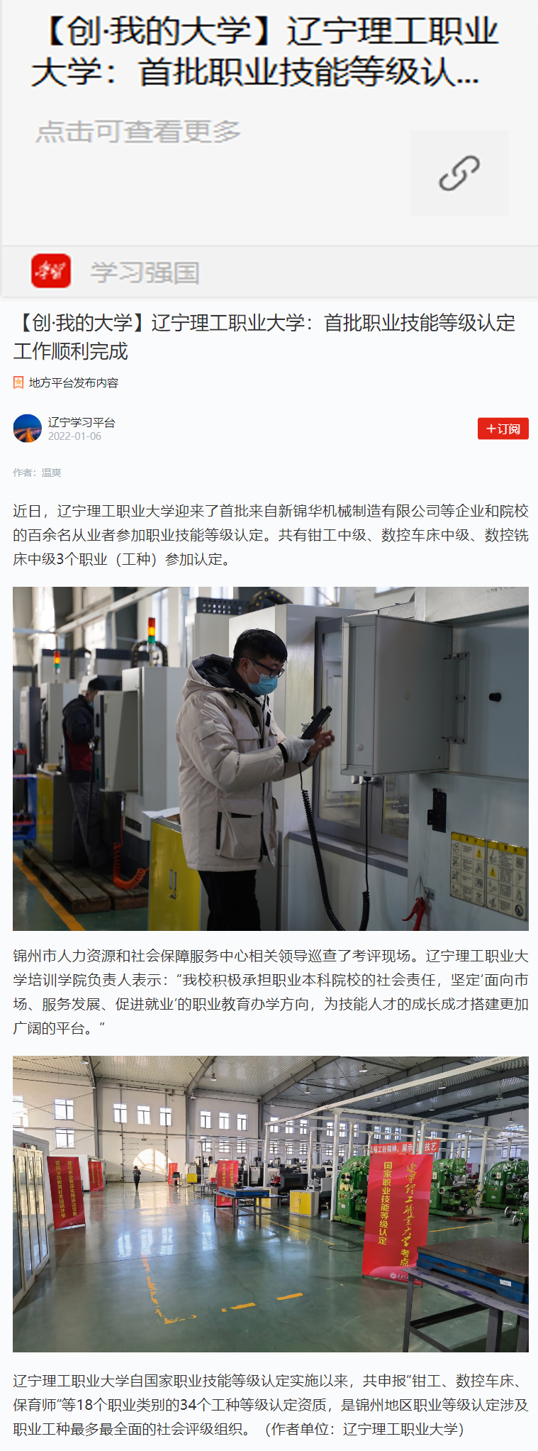 2021年末,我校开展了首批全国职业技能等级认定工作,历时两天,百余人参加。此项工作不仅在社会上颇有反响,还引起多家媒体的热切关注,《学习强国》辽宁学习平台以“辽宁理工职业大学:首批职业技能等级认定工作顺利完成”为题进行了报道;《辽宁日报北国客户端》以"锦州百名技能人才进行职业等级认定"为题,对我校首批全国职业技能等级认定工作进行了深度报道;同时《辽宁日报北国网》教育专栏也以"辽宁理工职业大学首批职业技能等级认定工作顺利完成"为题进行了报道;《锦州日报》以"国家职业技能等级认定在锦顺利开展"为题进行了详细报道。