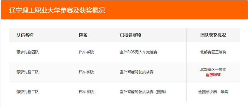 在北部赛区比赛中我校以李绍民教授为领队,李占林,生立强老师为指导老师的“强梦先锋四队”获得室外ROS无人车赛三等奖,孙岐峰、段敏老师为指导老师的“强梦先锋二队”获得室外智能驾驶挑战赛一等奖。“强梦先锋二队”代表北部赛区参加全国比赛。