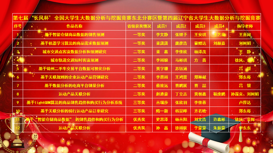 2023年12月2日至3日,由辽宁省教育厅主办、沈阳理工大学承办、北京络捷斯特科技发展股份有限公司协办的第七届“长风杯”全国大学生大数据分析与挖掘竞赛东北分赛区暨第四届辽宁省大学生大数据分析与挖掘竞赛在沈阳理工大学举行,全省共计402支队伍1391人参加初赛,经过专家评审有151支队伍进入决赛。我校8支队伍进入总决赛,学生团队在指导教师的带领下使用比赛提供的数据挖掘和Python实验平台完成问题建模、数据处理、数据分析和结果验证等内容,并提交数据分析报告。决赛阶段,晋级团队完成选题的进一步优化和深度挖掘,参与现场答辩,最终,获得一等奖2项,二等奖6项,三等奖2项,优秀奖2项。