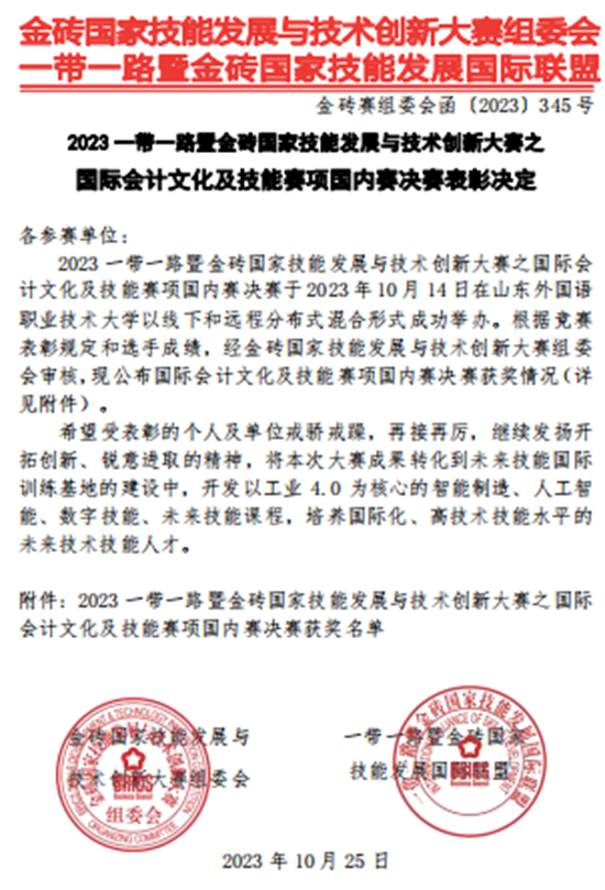 为积极贯彻落实《国家职业教育改革实施方案》以及财政部下发的《会计改革与发展“十四五”规划纲要》等文件精神,秉承“坚持以学生发展为中心,以就业为导向”的竞赛理念,2023一带一路暨金砖国家技能发展与技术创新大赛【国际会计文化及技能赛项】于2023年9月9日拉开序幕。本次比赛分为省赛和国赛,我校财经学院以吴玉平院长、张旬老师为指导教师组建的参赛队伍,最终在全国选拔赛中以国家级二等奖佳绩,为学校获得荣誉。