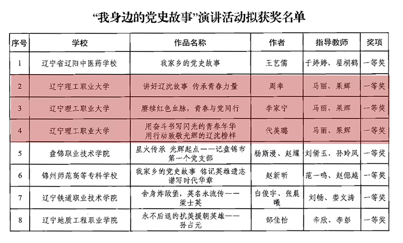 据悉,本次活动是根据《教育部办公厅关于在职业院校开展“技能成才强国有我”主题教育活动的通知》要求,辽宁省举办的“技能成才强国有我”系列教育活动主题教育活动。我校各党支部积极参加,创新活动载体,突出职教特色,由创新创业党支部上报的《讲好辽沈故事 传承青春力量》《赓续红色血脉,青春与党同行》《用奋斗书写闪光的青春年华 用行动致敬光辉的辽沈榜样》3个作品,荣获“我身边的党史故事”主题系列一等奖;由建筑学院党支部上报的《做一个‘成长’自己,不惧未来的人》作品荣获“榜样故事我来说”主题系列三等奖。