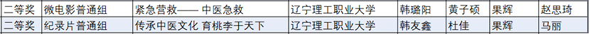 7月13日,2023年“和鲸杯”辽宁省普通高等学校本科大学生计算机设计竞赛作品获奖名单揭晓,创新创业学院果辉、赵思琦老师指导韩璐阳、黄子硕同学拍摄制作的微电影《紧急营救——中医急救》获微电影普通组二等奖,果辉、马丽老师指导韩友鑫、杜佳同学拍摄制作的纪录片《传承中医文化育桃李于天下》获纪录片普通组二等奖。