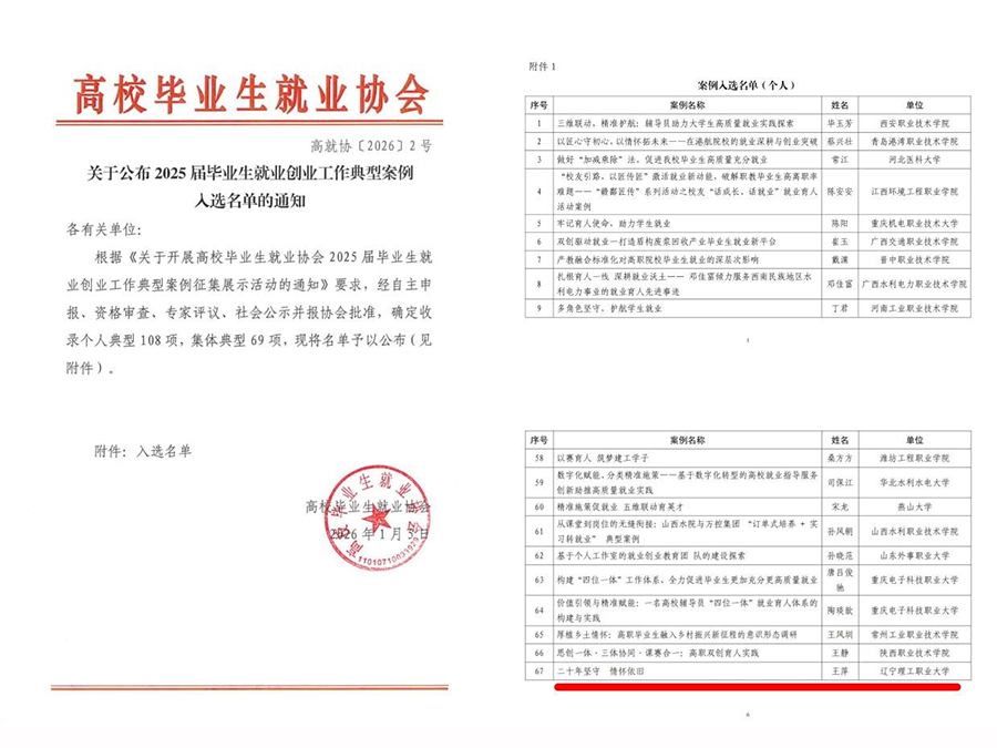 经高校毕业生就业协会历经五个月资格审查、专家评议、社会公示及协会审议批准,最终确定收录个人典型案例108项、集体典型案例69项,我校两项案例凭借鲜明的职业教育特色、扎实的工作成效及突出的示范价值,成功位列其中,成为全国高校毕业生就业创业工作的优秀范例。