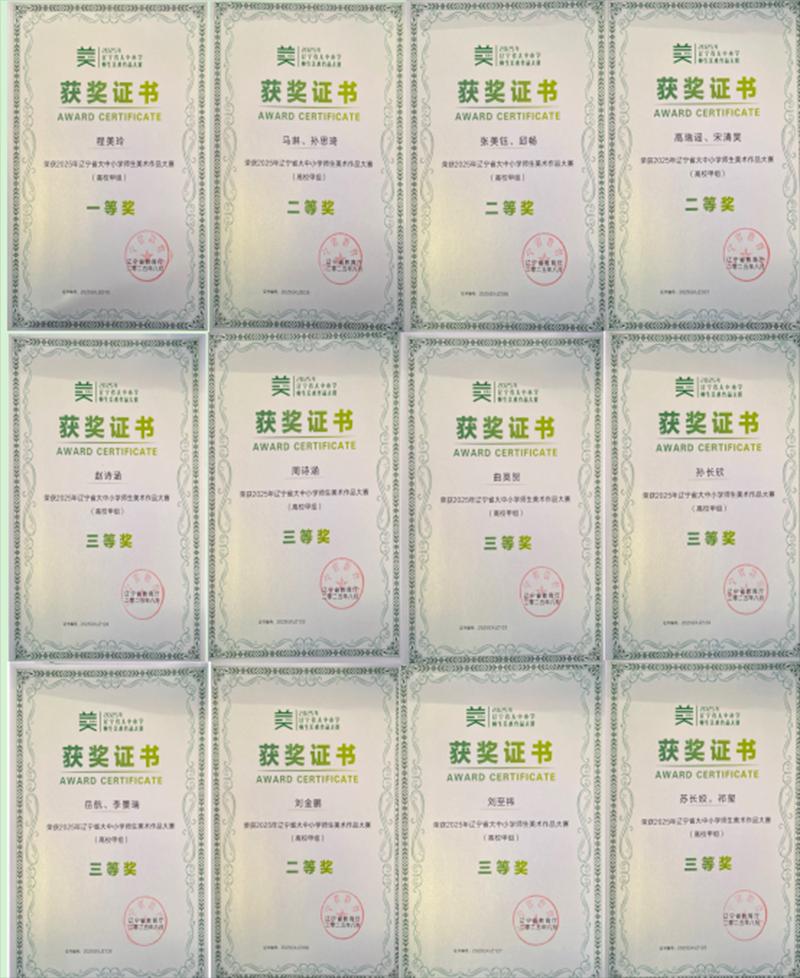 近日,我校在2025年辽宁省大中小学师生美术作品大赛中获得多个奖项。其中荣获省级一等奖1项、二等奖4项、三等奖8项。