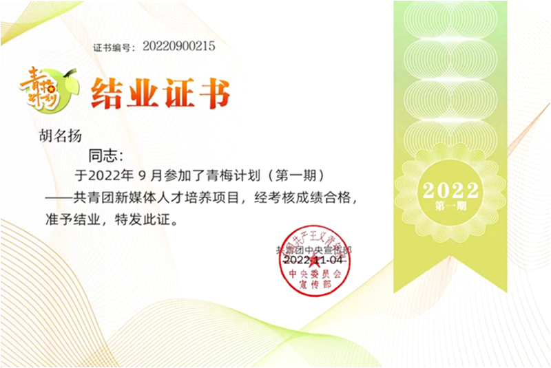 胡名扬同学来自信息学院2021级软件工程技术4班,目前担任校团委新媒体部干事和班级团支书,曾获评优秀团员、信息学院优秀班级干部,并且在校团委微信公众号中发布了累计30篇文章。胡名扬同学秉着拓宽专业技能,学习新思想的精神,在此次“青梅计划”的培训中时刻保持专注,了解出各新媒体平台的异同点,初步掌握了各平台新媒体运营的策略及方法,并积极投身实践,以求真务实的态度努力成为一名优秀的团属新媒体人。