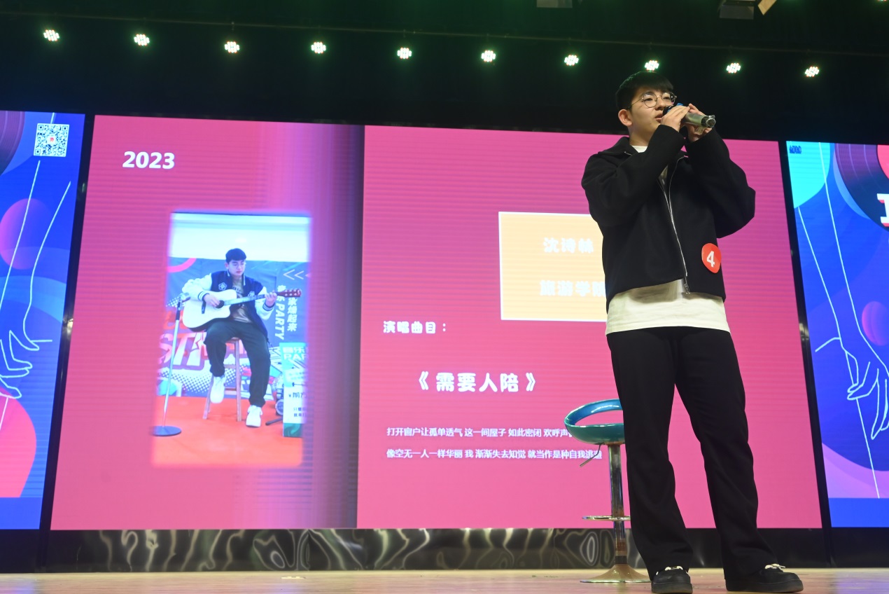 旅游学院2021级航空高铁专业的沈诗林同学带来了一首《需要人陪》。歌声平静,但情感却快要按奈不住,“像是在音乐餐厅听到一个歌手潺潺诉说都市之人的寂寞”,令人为之动容。