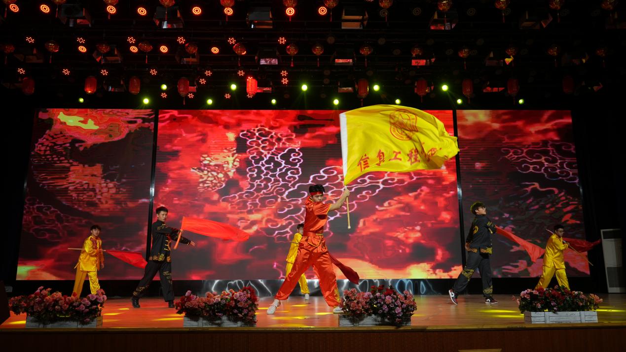 信息工程学院带来的武术表演《旗韵武风耀中华》震撼登场。表演者们身着武术服,手持旗帜,身姿挺拔,神情坚毅。他们将武术的技巧与旗帜的韵律完美融合,展示了武术的阳刚之美和技巧的精湛高超,体现了旗帜文化所蕴含的深厚底蕴。