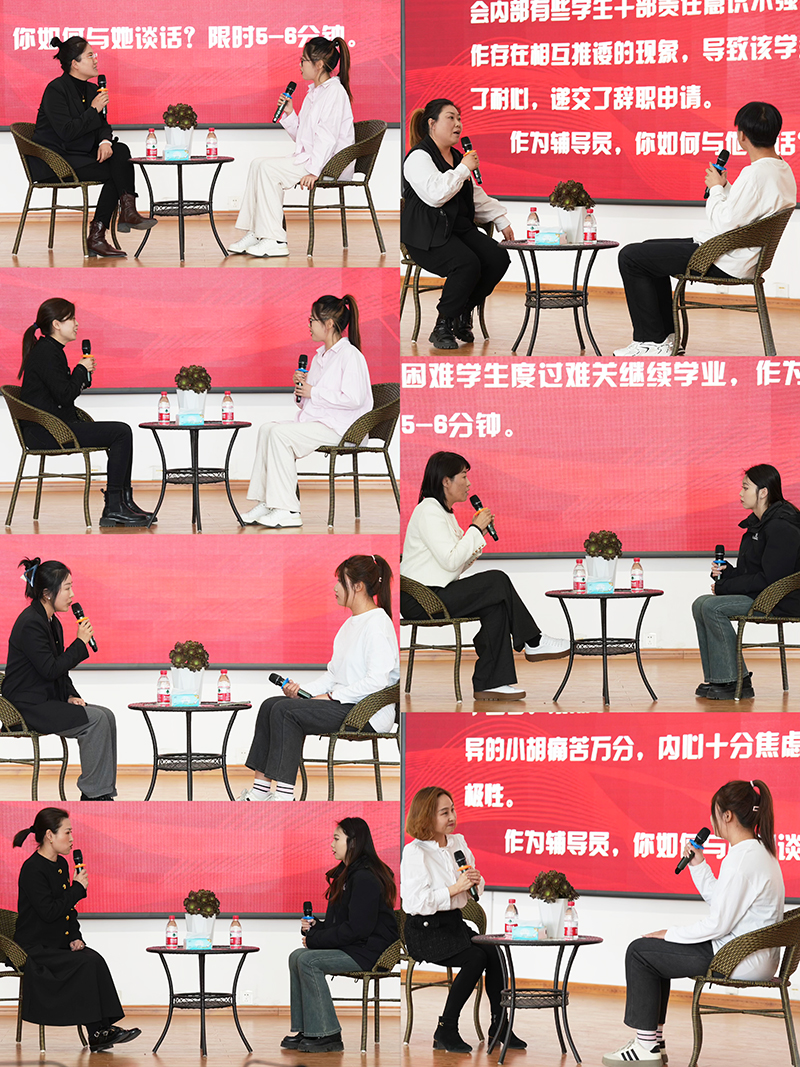 比赛分为案例分析和谈心谈话两个环节,充分考察了辅导员们的理论知识水平、解决问题能力和教育引导能力。在案例分析环节,辅导员们针对案例要点抽丝剥茧,从思想价值引领、政策理论教育、专业知识指导、规章制度解释、师生沟通共情等方面研讨解析,展现出了良好的逻辑思维能力。在谈心谈话环节,辅导员们与助演学生还原了日常工作中师生面对面谈话的场景,展现出辅导员对学生的教育引导能力、解决理论困惑和实际问题的素养。面对助演学生即兴抛出的问题,辅导员们设身处地开展思政教育工作,分析他们烦恼的根源,帮助学生找到走出困境的方法,也体现了辅导员在工作中的积极探索以及对学生工作的思考。