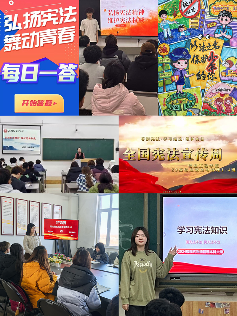 在12月2日-4日期间,各学院以“弘扬宪法精神 维护宪法权威”“大力弘扬宪法精神 推动进一步全面深化改革”为主题,深入开展主题班会、普法宣讲、知识竞赛、辩论比赛、座谈会、制作宣传海报、绘制漫画、制作短视频等多种形式的宪法学习宣传教育活动。重点学习宣传习近平新时代中国特色社会主义思想和党的二十大、党的二十届三中全会精神;深入学习宣传宪法、民法典、教育法律法规以及国旗法、国歌法、国徽法、爱国主义教育法等相关法律知识,学习新中国宪法发展历程和宪法的地位作用、新中国成立75年来特别是党的十八大以来全面依法治国取得的历史性成就等,推动形成尊崇宪法、学习宪法、遵守宪法、维护宪法、运用宪法的良好氛围。
