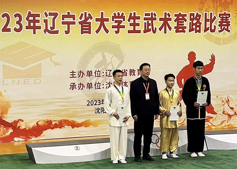 辽宁省大学生武术套路比赛在沈阳市于2023年4月8日举行,本次比赛只有单项奖,我校派出代表队参加了高职高专组的比赛,并在双刀、单刀和长拳三个项目中分别获得第一名、第二名、第二名的好成绩。